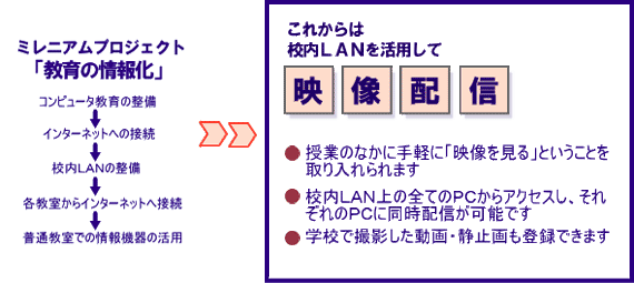 普通教室にある校内LAN上のPCとプロジェクタを活用して通常の授業時にも簡単に、クラス全員で映像を見ることができます